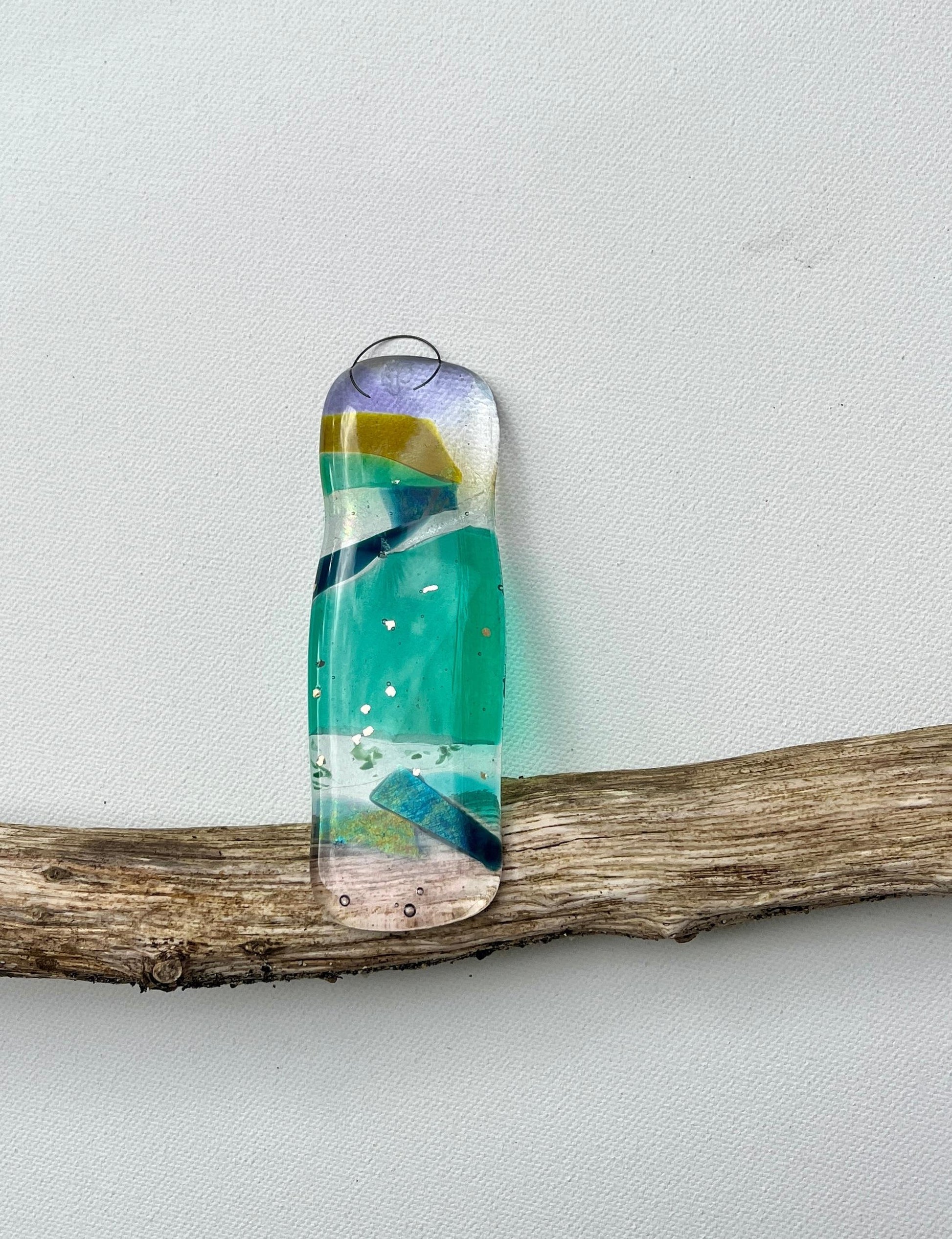 Olivine is a collection of playful, kiln-formed fused glass pendants, inspired by rock formations and seascapes in pale blues, greens and earth tones. Handmade from colourful transparent, opaque, and iridescent hand-rolled glass mixed with vintage offcuts. They can hang alone or in a group for a mobile effect. Each pendant is absolutely unique and brings a peaceful vibe and colourful light into your room.