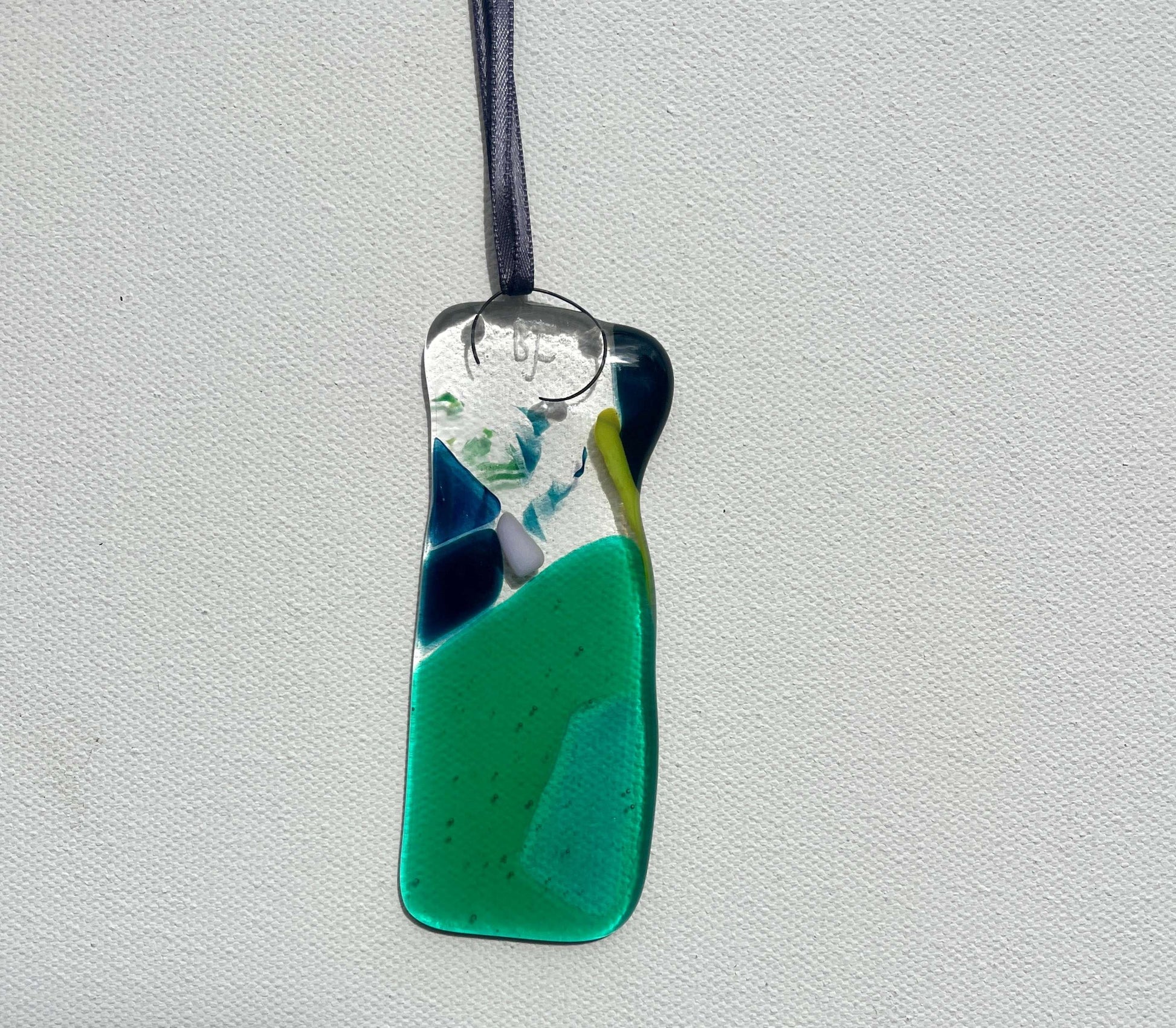 Olivine is a collection of playful, kiln-formed fused glass pendants, inspired by rock formations and seascapes in pale blues, greens and earth tones. Handmade from colourful transparent, opaque, and iridescent hand-rolled glass mixed with vintage offcuts. They can hang alone or in a group for a mobile effect. Each pendant is absolutely unique and brings a peaceful vibe and colourful light into your room.